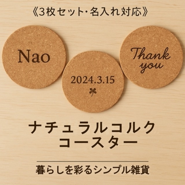 《3枚セット》名入れ対応 ナチュラルコルクコースター|暮らしを彩るオーダーメイド雑貨
